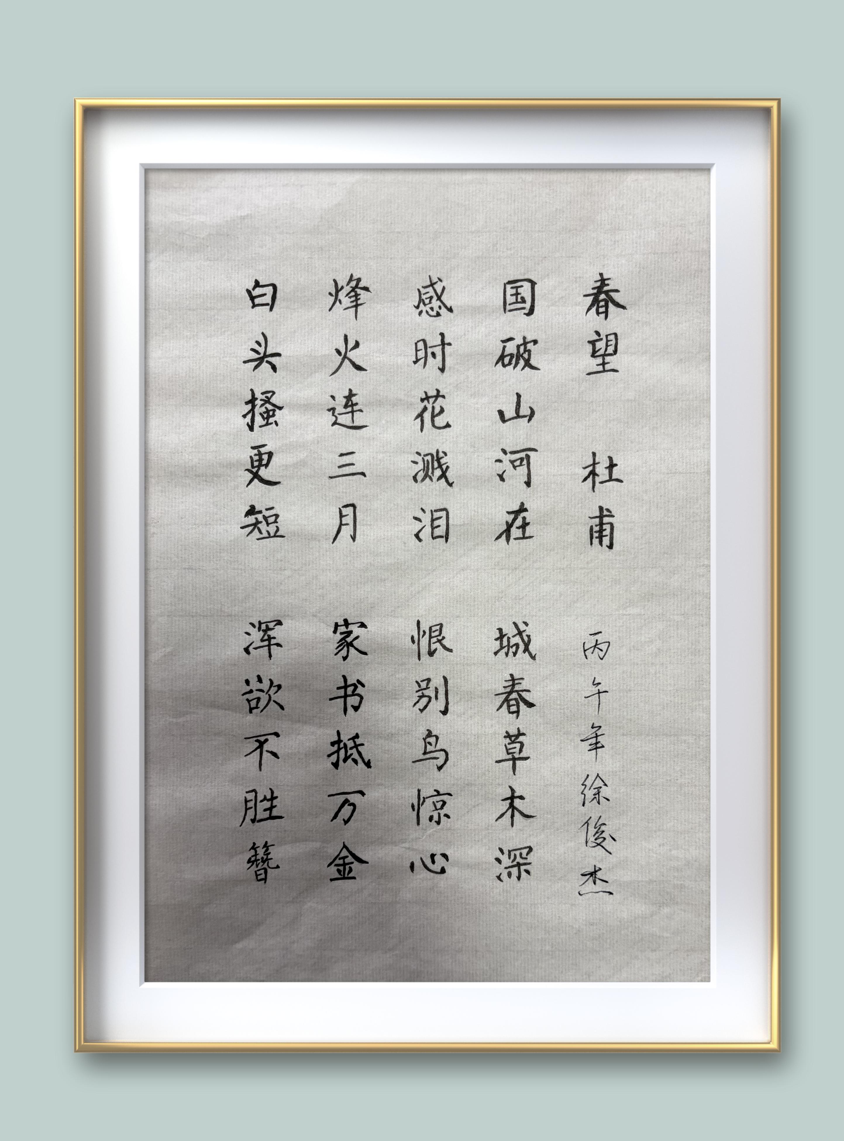 徐俊杰,男,汉族,于二0一三年九月生于山东省青岛市胶州市,现就读于山东省胶州市方井小学。硬笔书法考级八级,现为北京当代翰墨文化艺术院硬笔书法会员。自幼酷爱书法艺术,多次参加全国及省级书法大赛并获奖。在二0二三年学校组织的书法比赛中,荣获“校园小明星”。在二0二四年书法比赛中,荣获“校园小书法家。二0二五参加山东省青少年艺术节“节气入画、翰墨传时”书法大赛中荣获一等奖。参加第四十二届国际少儿书画大赛中获特别金奖,作品入选巜创造未来》书画集2026年1月,被选入北京当代翰墨文化艺术院人才库,作品在新时代艺术名家网展出。