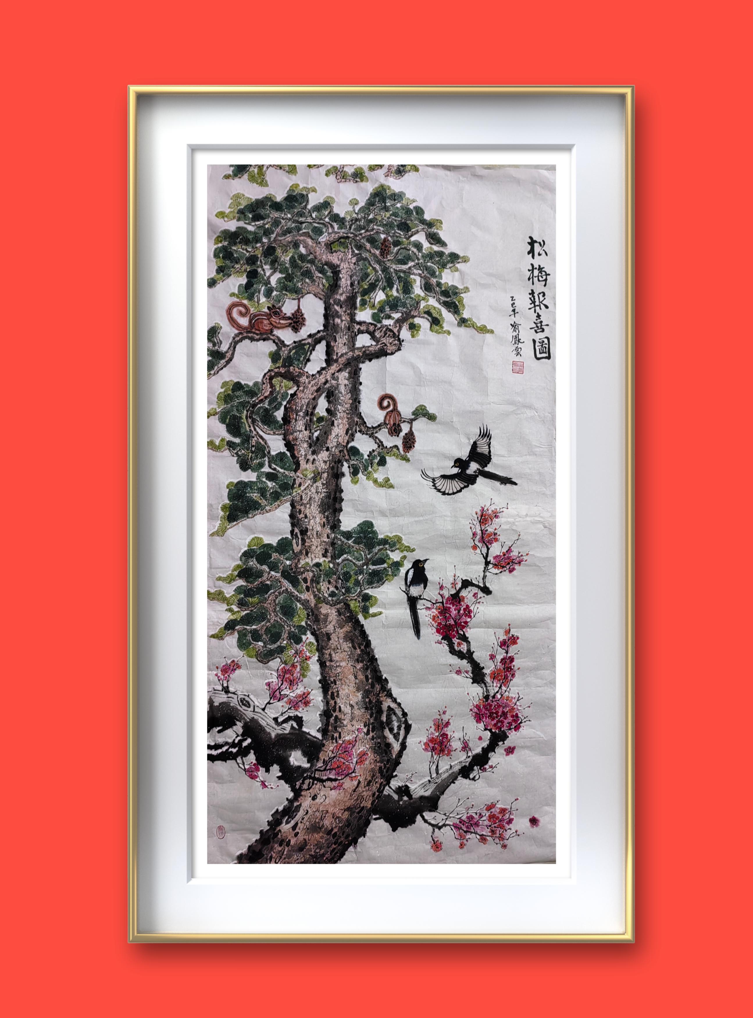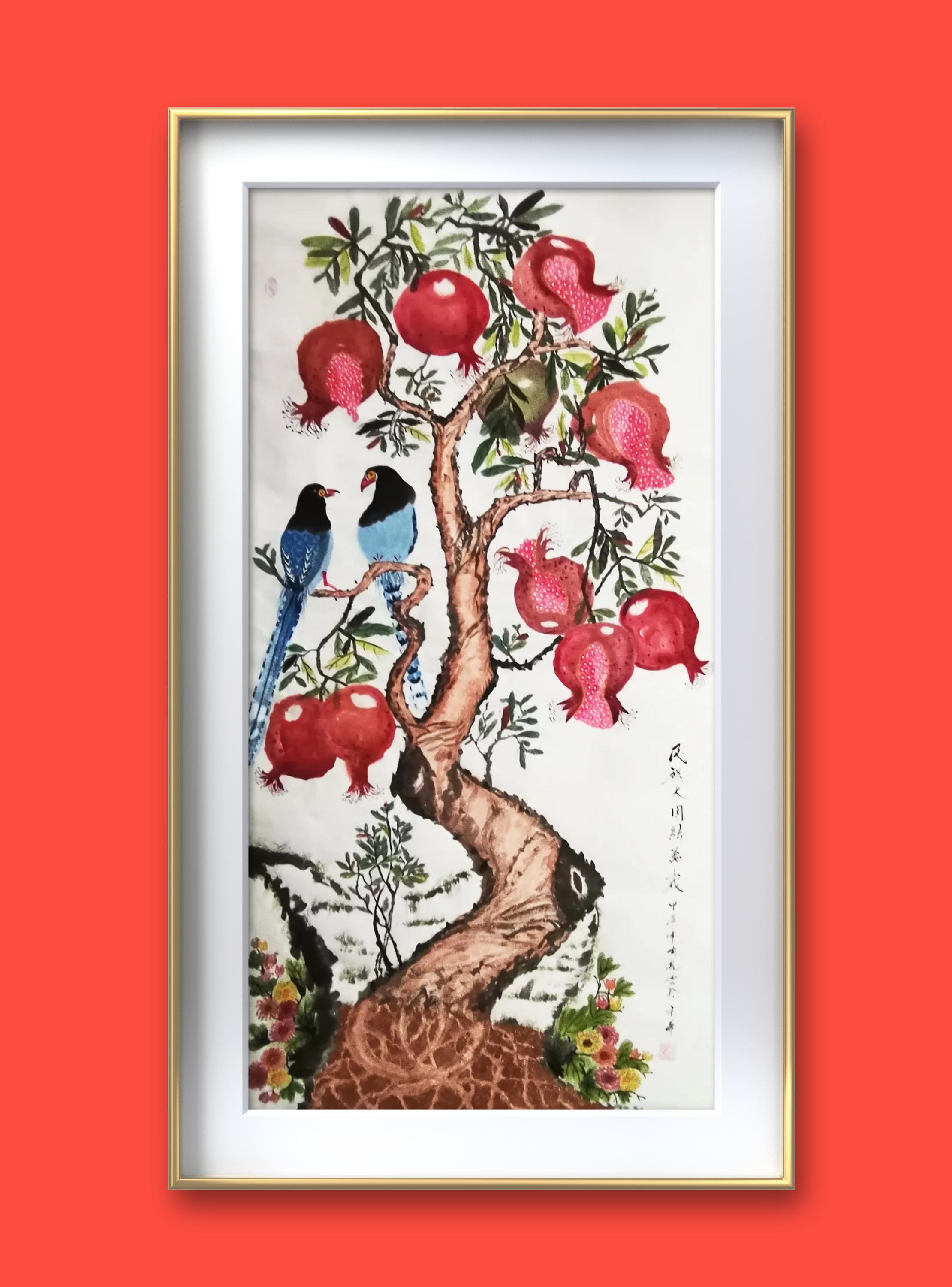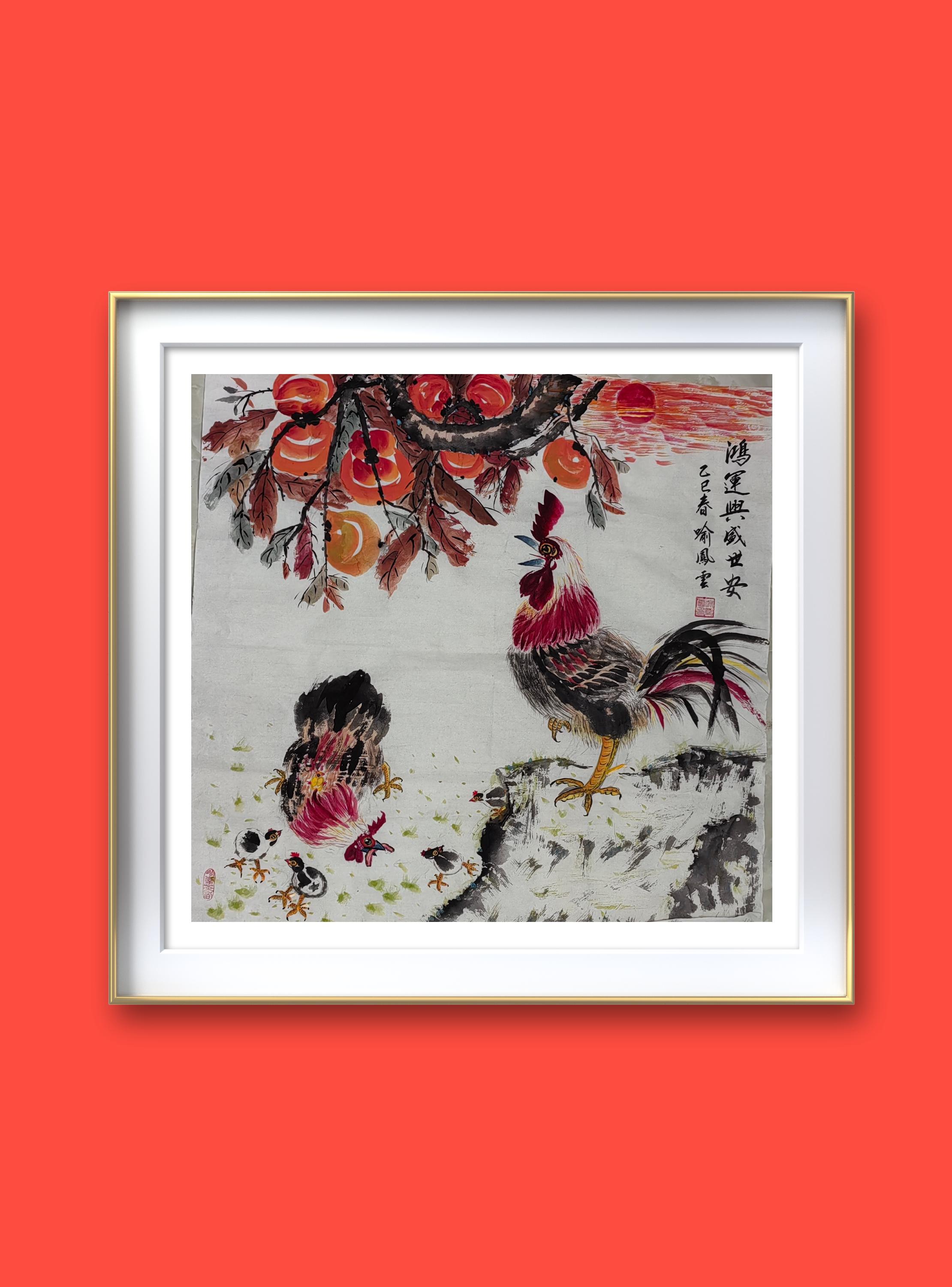 2.《鸿运兴 盛世安》是赠送属鸡的大姑姐一家的礼物。每只鸡代表家庭中的一个人,三代七口人。口叼五花肉的母鸡是大姐,其背上的鸡宝宝是大姐三岁的孙子。只露出半个身子的小鸡是头戴红花小鸡的男朋友……作品名称嵌入大姐姐夫及儿孙四人的名字。祝姐姐一家鸿运高照,兴旺发达,尽享盛世和平安宁。祝祖国繁荣昌盛,平安吉祥。更为有意思的是:这幅画完成的第二天,就传来喜信,各自寻觅多年未果的他们即将步入婚姻的殿堂......大家说我的画给这个家族带来了鸿运。该画为大家讲述中国亿万普通家庭幸福和美的故事,也为我带来高光时刻。