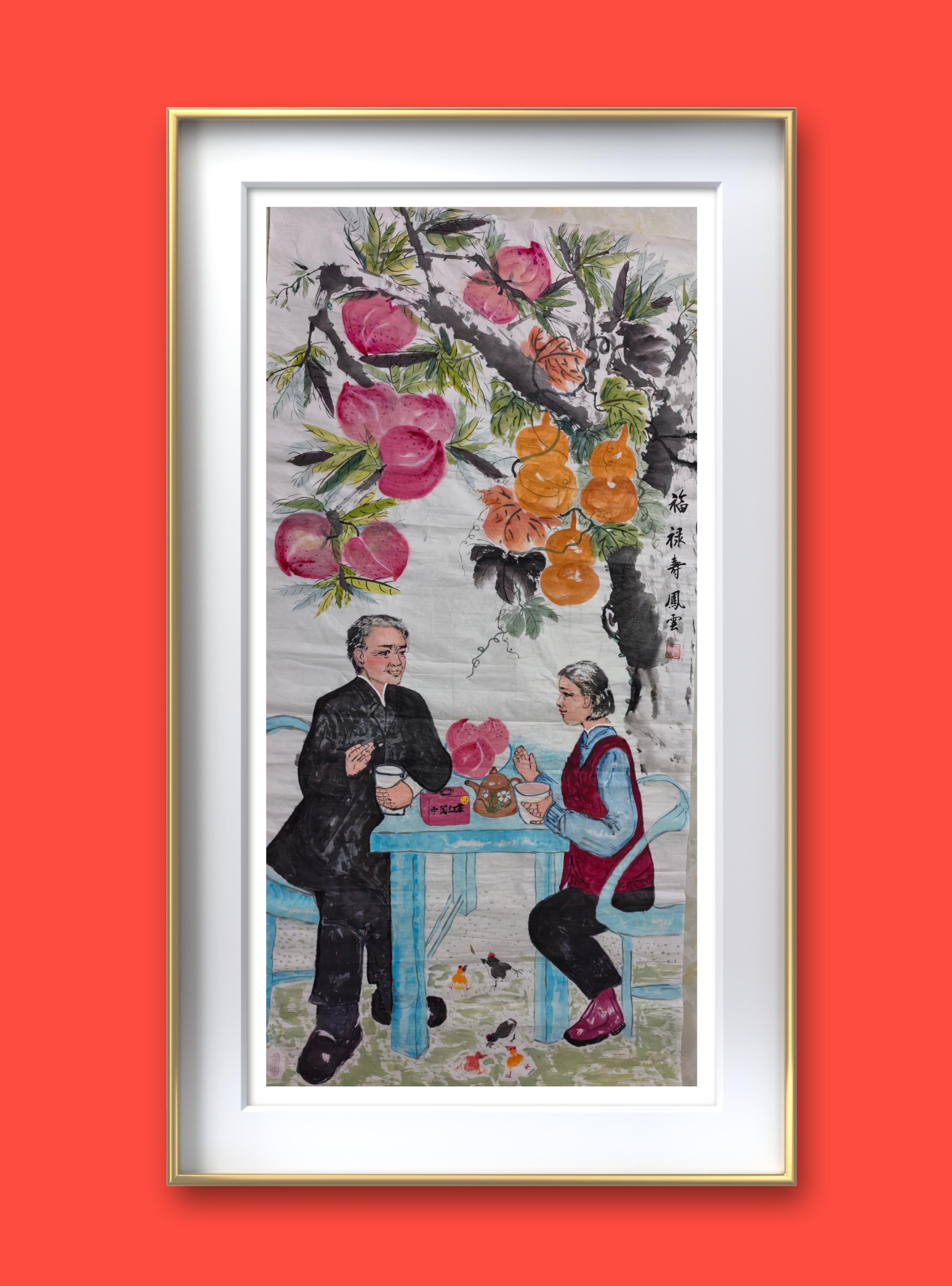 老人头顶上鲜亮寿桃挂满枝头,蜿蜒藤蔓上长着金黄色葫芦,象征中国农村普通农家的日子红红火火,富足安康。高寿甚至百岁老人越来越多,农村和大城市的差别很小啦!桌下绿地上一小片飘落的红茶叶芽吸引一黄一黑两只小鸡的目光。画面最下面一只小黑鸡嘴里叼着一条小绿虫子,旁边一赭色一黄色两只小鸡从不同方向奔向小黑鸡……画面中活泼可爱的小鸡展现了浓浓田园气息。