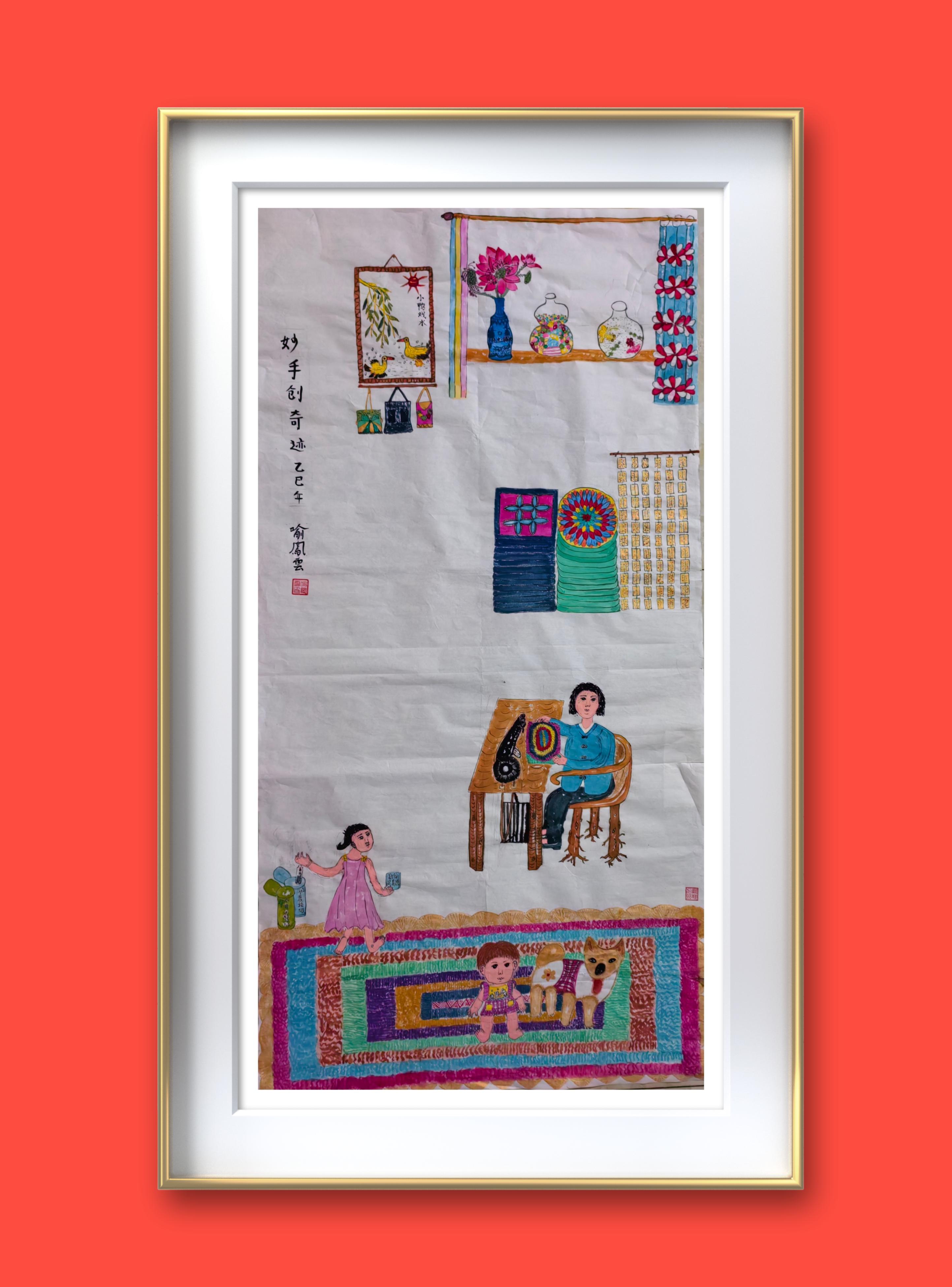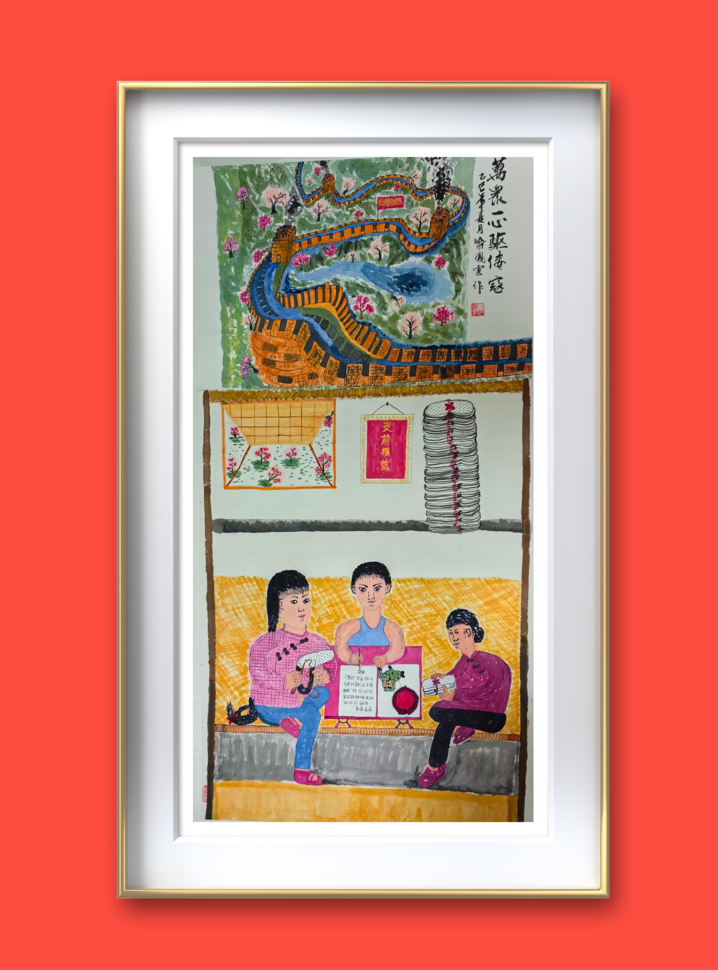 3.《万众一心驱倭寇》为纪念抗日战争暨反法西斯战争胜利80周年创作。画面近景是怀柔长城脚下普通农家,土炕上坐着祖孙三人。奶奶和妈妈忙着为游击队员做千层底布鞋,背后墙上挂着的“支前模范”锦旗是对她们默默奉献的肯定。小男孩叫抗战,在给抗日游击队里的爷爷爸爸写信:“快点把鬼子打跑吧,你们好早点回家……”。小抗战还在纸上画了由多个小红心组成的大红心,大红心向跪着的小鬼子射出三支利箭。借小抗战的笔表达全国人民万众一心,赶走日本鬼子的雄心壮志。推开窗子,近景是果园,远景是明长城。飘扬的红旗上写着“长城游击队”。小男孩的爷爷爸爸等无数仁人志士浴血奋战,守家为国,坚持抗战十四年,筑起中华民族不屈的脊梁,书写了中华民族近代史抗击外敌首胜的辉煌历史。体现中国共产党领导下华夏民众老少妇孺万众一心驱倭寇抗战精神。
